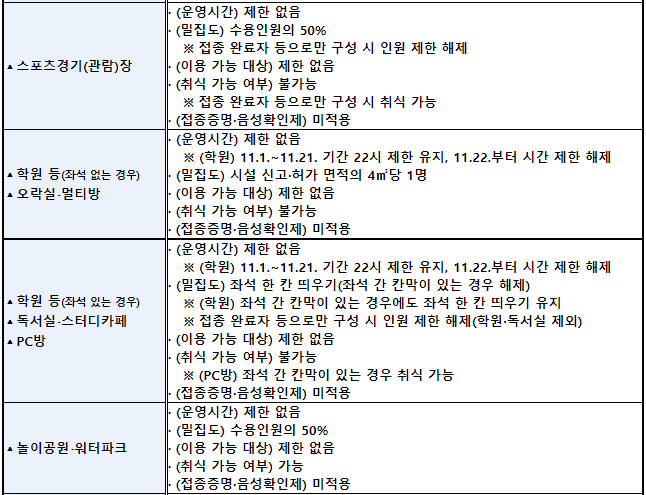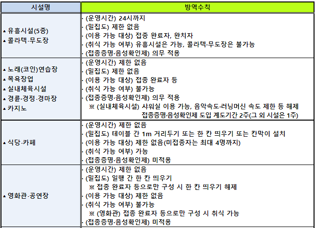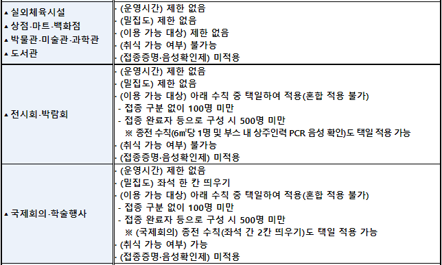 * 접종 완료자 등 : 접종 완료자, PCR검사 음성자(48시간), 18세 이하, 완치자, 건강 사유 등 불가피한 접종 불가자