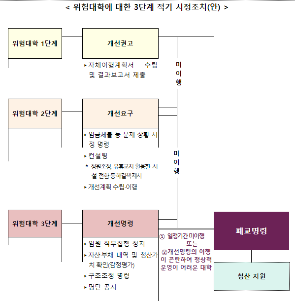 ◦ 위험대학에 대해서는 위험 수준에 따라 3단계 시정조치(개선권고 → 개선요구 → 개선명령)를 실시하고, 최종 단계인 개선명령을 이행하지 않거나 회생이 불가능한 경우 폐교명령을 실시한다.