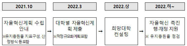 ◦ 자율혁신대학은 일반재정지원과 연계하여, 각 대학의 여건 및 역량, 발전전략* 등에 따라 적정 규모화를 포함한 자율혁신계획을 수립‧추진(2022.상~)한다.