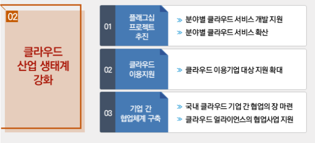 4. 마지막으로 공공과 민간의 클라우드 전환에 국내 클라우드 기업이 적극 참여할 수 있도록 클라우드 서비스의 품질을 높이고 서비스 수를 확대하는 ‘클라우드 플래그십 사업’을 추진한다.
