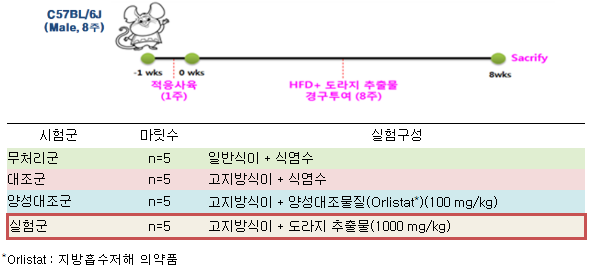 ○ 고지방식이로 비만을 유도한 쥐(C57BL/6J, male, 8주)에 8주간 도라지 추출물(1 g/kg, 쥐 한 마리: 20∼40 g)을 섭취시킨 결과, 혈중 중성지방 및 혈중 콜레스테롤, 저밀도 콜레스테롤은 줄고 고밀도 콜레스테롤은 늘어 혈중 중성지방 지표가 개선되는 효과를 확인하였다.