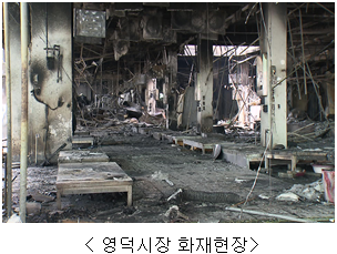 ㅇ 영덕읍의 중심상권인 영덕시장은 지난 9월 4일에 발생한 화재로 시장건물과 상인점포(79개소)가 소실되었다. 시장상인들의 생업을 빠르게 복구하기 위해 도시재생 인정사업을 통해 ’25년까지 시장 재건에 총 217억원(국비 50억원)을 투입할 계획이다. 또한, 활력센터(창업멘토실, 쉼터, 다목적실 등) 및 공영주차장 200면을 확충하여 시장상인‧인근지역민의 문화생활을 지원하고 시장을 활성화할 계획이다.
