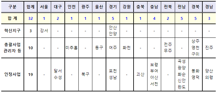 □ 국토교통부(장관 노형욱)는 제29차 도시재생특별위원회(위원장 김부겸 국무총리)*를 통해, 올해 3차 신규 도시재생 뉴딜사업으로 서울 강서, 경기 안양 등 총 32곳을 선정하였다.