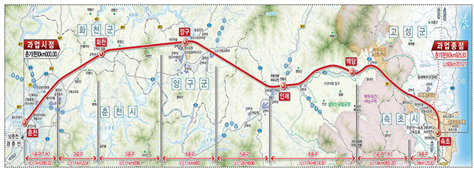 6년간 93.7km의 철도를 신설하며 화천, 양구, 인제, 백담, 속초 5개 정거장을 만듭니다.