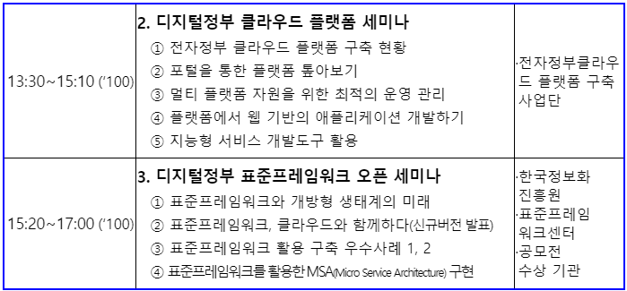 또한 디지털정부 클라우드 컨퍼런스 행사에서는 클라우드 전환을 준비 중인 행정기관과 공공기관 및 산업계 실무자가 참고할 수 있도록 범정부 클라우드 플랫폼의 구성과 이용 방법을 시연하고, 표준프레임워크 신규 버전을 공유합니다.