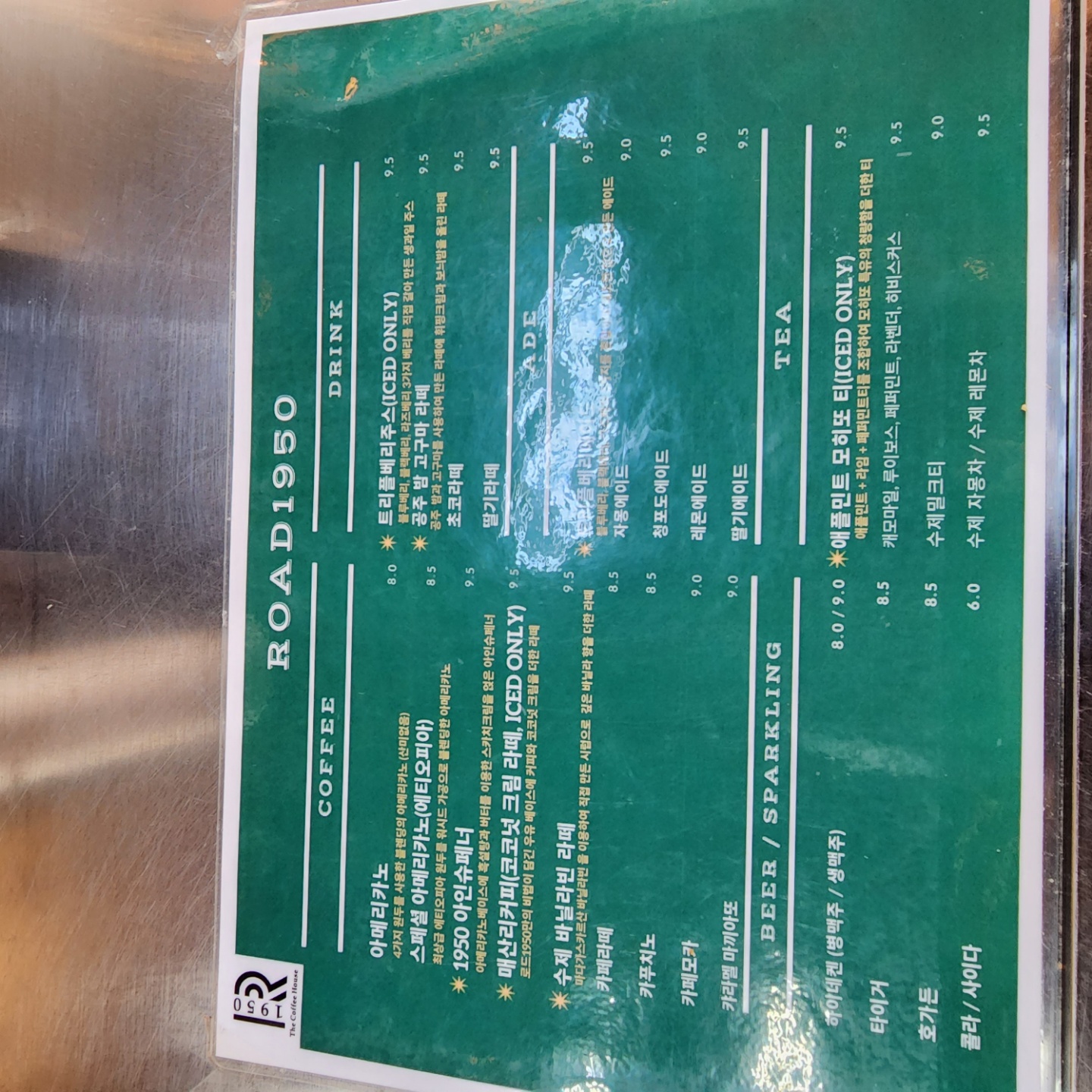 로드 1950 가격표를 봤는데, 헐~~ 가격이 좀 사악하네요~ 아메가 8천 원입니다. 다른 음료는 8.5천 원에서 9.5천 원까지 있습니다.