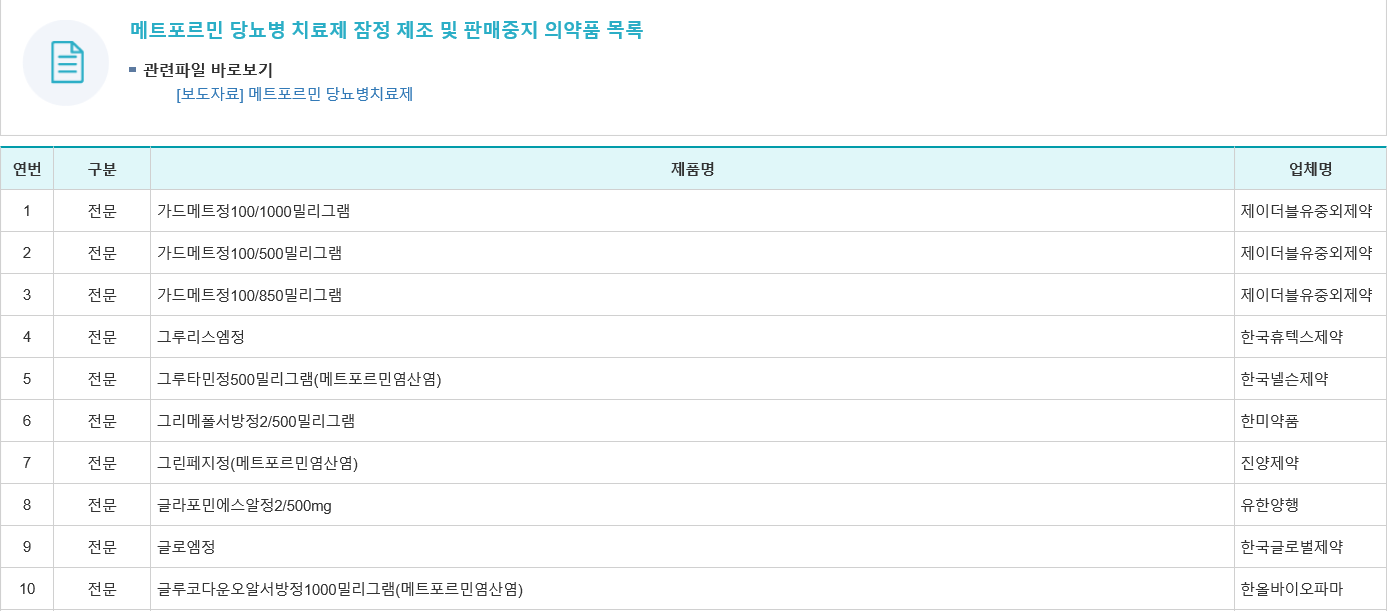 본 저작물은 ‘보건복지부’에서 ‘20년’ 작성하여 공공누리 제1유형으로 개방한 ‘메트포르민 당뇨병치료제 31품목 잠정 제조ㆍ판매 중지(작성자:이은지)’을 이용하였으며, 해당 저작물은 ‘보건복지부 홈페이지’에서 무료로 다운받으실 수 있습니다.