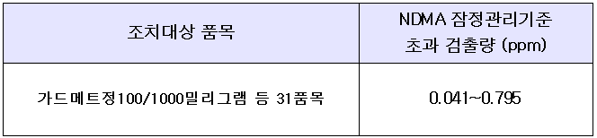 국내 유통 288품목 중 31품목에서 NDMA 잠정관리기준 초과 검출