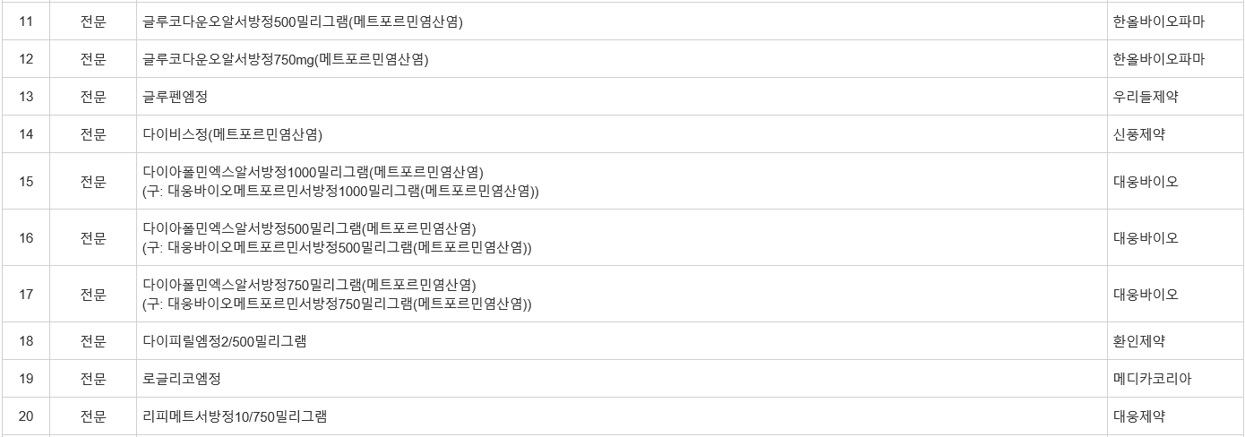 * 메트포르민 : 식이요법과 운동요법으로 혈당조절이 충분히 이루어지지 않는 당뇨병 환자의 치료에 사용되는 의약품 성분