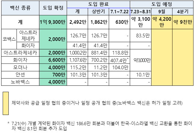 7월 22일(목) 모더나 백신 29만 회분이 도입되어 총 2,492만 회분의 백신이 도입 완료되었고, 8월 말까지 약 3,100만 회분의 백신이 추가 공급될 예정으로, 백신별 세부적인 공급 일정은 제약사와 협의되는 대로 공개 가능한 범위에서 안내할 예정입니다.