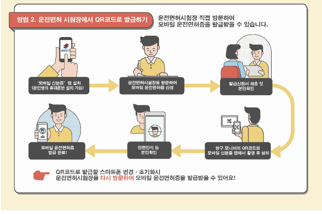 하지만 스마트폰 교체나 분실 등으로 모바일 운전면허증을 다시 발급받아야 할 경우, 운전면허시험장을 재방문하여야 합니다.