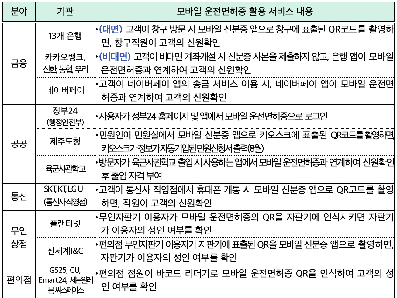 * 더욱 자세한 모바일 운전면허증 사용처별 내용은 아래의 표를 참고하세요~