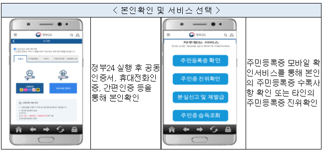 ☞ 스마트폰으로 ‘정부24’ 모바일앱을 실행시켜 ‘주민등록증 모바일 확인서비스’를 이용하면 주민등록증을 휴대하지 않고도 신분확인이 가능하다.