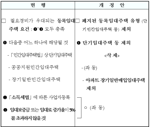 * (주요내용) 단기민간임대주택 및 아파트 장기일반매입임대주택 유형 폐지, 폐지 유형의 자진등록말소 허용, 최소임대기간 경과시 자동등록말소