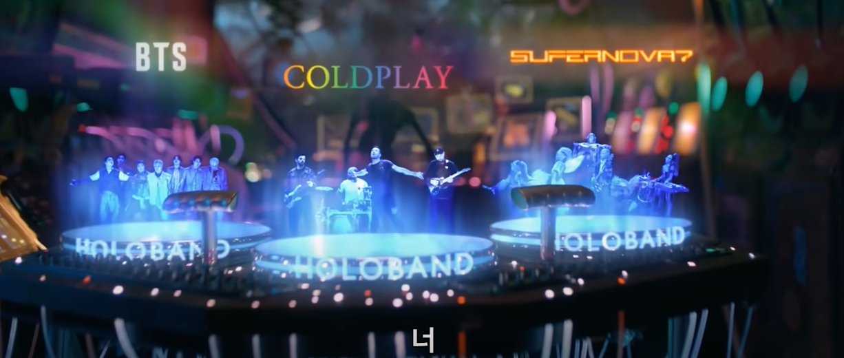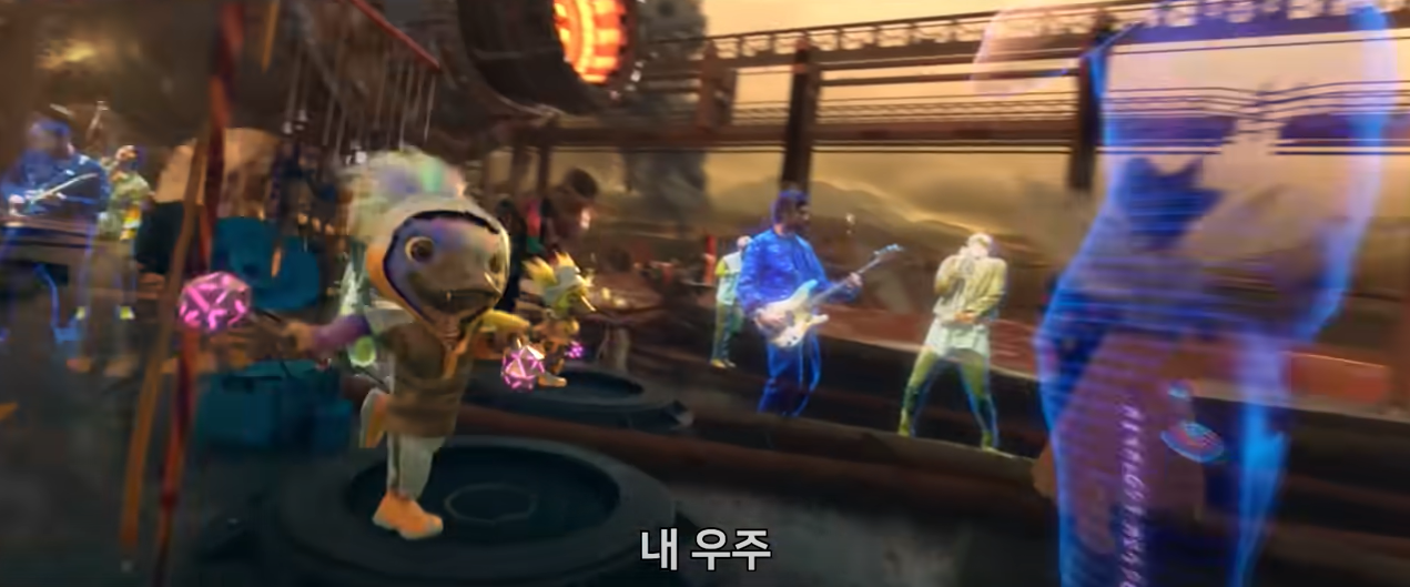 방탄소년단, 콜드플레이(Coldplay)의 ‘마이 유니버스(My Universe)’ 뮤직비디오 영상에는 방탄소년단, 콜드플레이(Coldplay) 그리고 외계인 밴드 슈퍼노바7 들이 서로 다른 행성에 있는 세 그룹으로 홀로그램으로 연결돼 함께 공연을 하는 장면을 연출합니다.