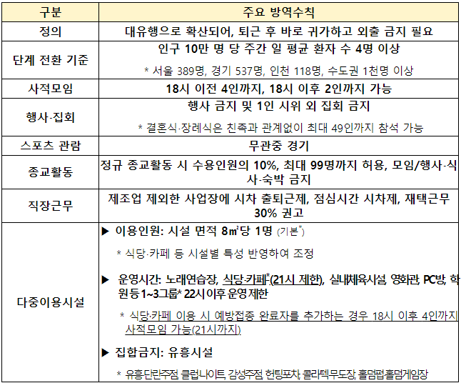 사회적 거리두기 방역수칙 세부내용(비수도권 3, 수도권 4단계)
