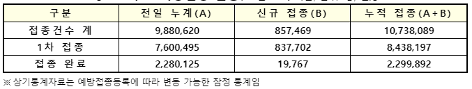 ○ 또한 오늘 하루 접종건수는 총 85.7만 건(1차 83.8만 건, 2차 2만 건)으로 지난 5월 27일 일일 접종건수 71.6만 건(1차 66.2만 건, 2차 5.5만 건) 보다도 높은 수치를 기록하여 일일 최다 접종건수를 기록하였으며, 1차접종도 800만 명을 초과(인구 대비 접종률 16.4%)했다고 밝혔다.