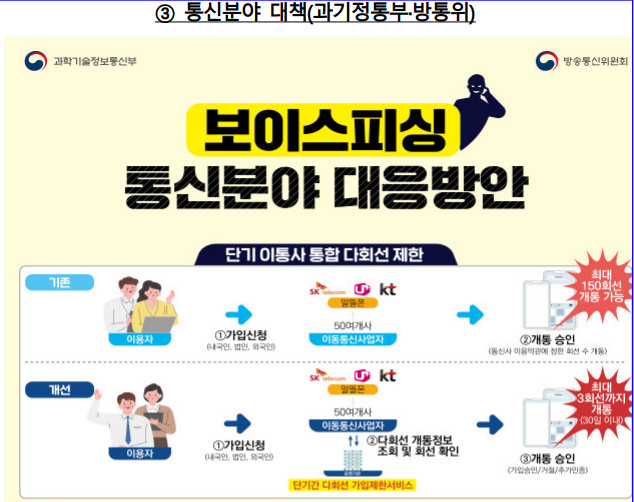 정부는 날로 지능화되고 있는 보이스피싱을 방지하기 위해서 대책을 세우고 보도했습니다. 대표적인 대책으로는 휴대전화 개통 회선수를 3개로 제한하고, ATM 입금을 50만 원으로 축소, 수취한도는 300만 원으로 제한하는 제도가 시행됩니다.