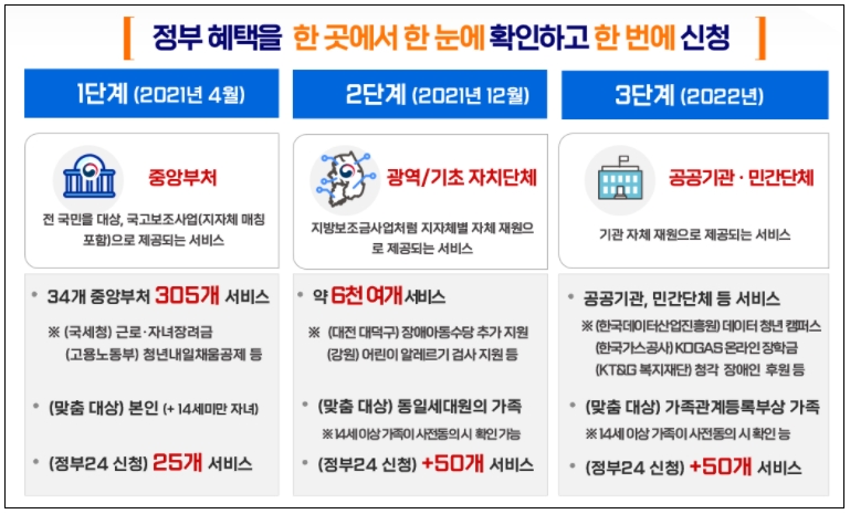 □ 한편, 이번 중앙부처 서비스를 시작으로 올 연말에는 지자체 서비스(6천여 개), 내년에는 공공기관과 민간단체 서비스까지 확인할 수 있도록 할 계획이다. 또, 본인뿐 아니라 가족들의 혜택도 포함하여 연로하신 부모님을 위해 혜택을 놓치는 일이 없도록 준비할 예정이다.