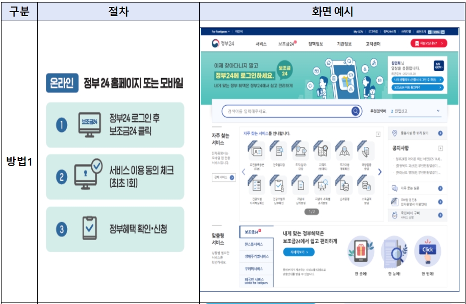 보조금24 이용방법 및 서비스 화면