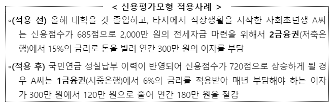 특히 사회초년생 등 금융거래 이력이 많지 않은 금융이력 부족자들이 비금융정보 반영을 통해 보다 타당한 신용평가를 받을 수 있게 되었습니다.