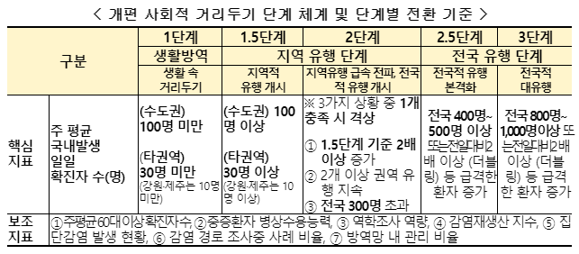 < 개편 사회적 거리두기 단계 체계 및 단계별 전환 기준 >