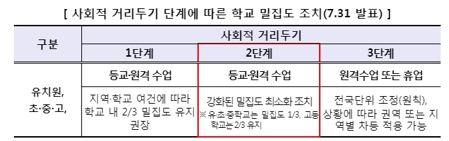 □ 앞서 교육부는 2학기 학교 밀집도 조치 방안을 발표(7.31)하면서, 사회적 거리두기 2단계 격상 시, ‘강화된 밀집도 최소화 조치’를 실시하고, 원격수업 전환 등 선제적 예방 조치를 시행한다고 밝힌 바 있다.