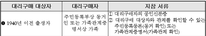 □ 가족관계증명서상 가족이 대리 구매할 수 있는 대상자는 ① 1940년 포함 이전 출생자, ② 2002년 포함 이후 출생자, ③ 임신부, ④ 병원 입원환자, ⑤ 장기요양 급여 수급자이다.