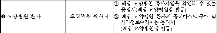 ○ ④ 병원 입원환자는 ▲대리구매자의 공인신분증 및 ▲주민등록등본(동거 확인) 또는 가족관계증명서(가족관계 확인), ▲해당 의료기관이 발급한 입원확인서를 제시하면 대리 구매 대상자의 5부제 요일에 공적 마스크를 구매할 수 있다.