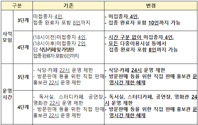 - 사적모임 기준을 단순화하고, 접종 완료자 제한 완화 -