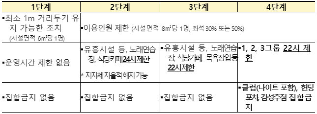 집합금지는 외출을 금지하는 4단계에서 방역 위험도가 높은 1그룹 시설 중 클럽나이트, 헌팅포차, 감성주점에만 적용한다.