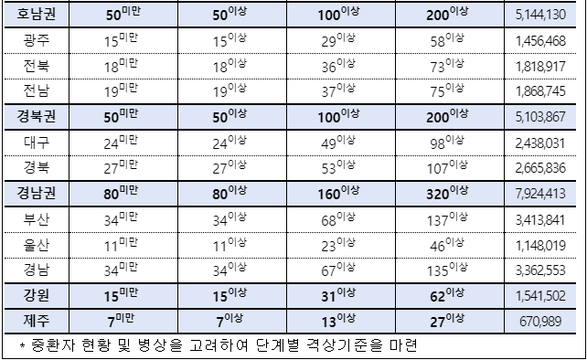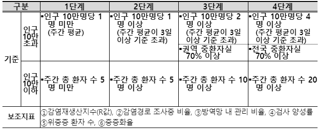 - , 인구 10만명 이하 지역은 주간 총 환자 수라는 별도의 기준을 마련하여 적용한다.
