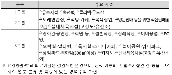 □ 시설의 운영규제는 최소화하며, 유행차단을 위한 필수 조치 중심으로 제한한다.