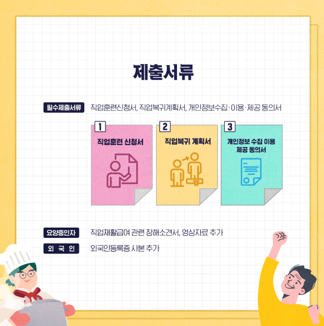 * 제출서류: 직업훈련 신청서, 직업복귀계획서, 개인정보수집·이용·제공 동의서