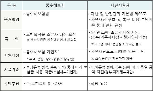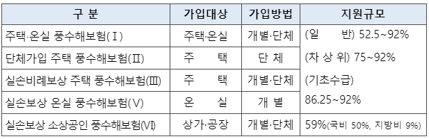 □ 풍수해보험은 2006년부터 시행되고 있는 보험으로 보험료의 절반을 정부가 보조하고 민간보험사가 판매하는 보험이다. 태풍, 홍수, 호우, 강풍, 풍랑, 해일, 대설, 지진 등으로 인한 파손과 침수 등을 보상한다.