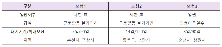 - 상병수당 모형1 : 질병유형 및 요양방법(입원, 외래, 재택요양) 제한이 없이 상병으로 근로 활동이 어려운 기간 동안 인정, 대기기간 7일, 최대 보장기간 90일입니다.