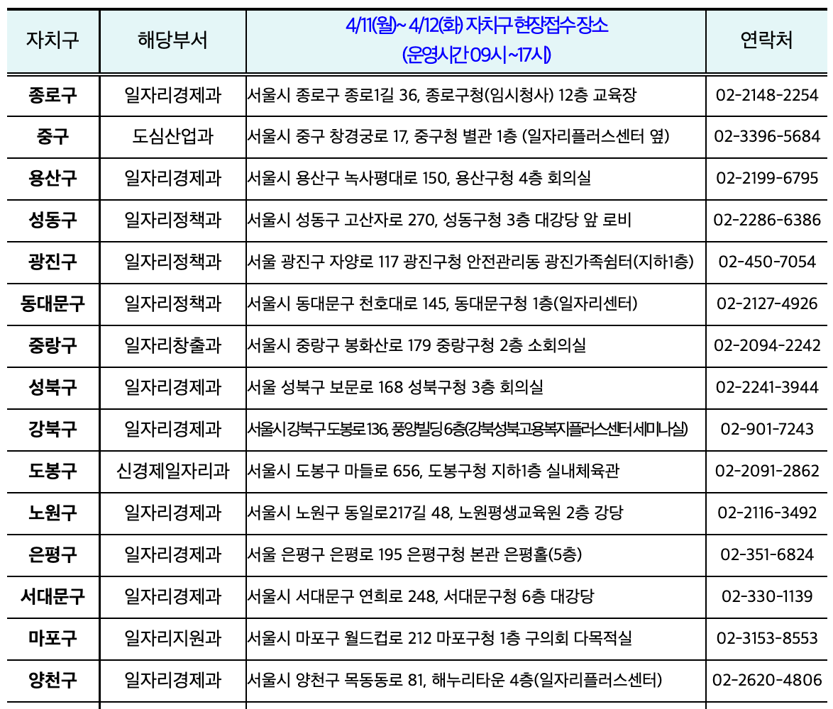 - 자치구별 1개소 긴급생계비 현장접수처 운영, 주소지 상관없이 가까운 접수처에서 신청가능