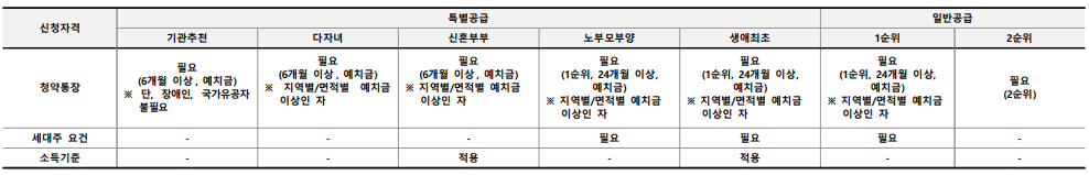 청약예금 : 해당 주택에 신청 가능한 청약예금에 가입하여 24개월이 경과하고, 청약예금 지역별, 면적별 예치금액 이상인 1순위 자
