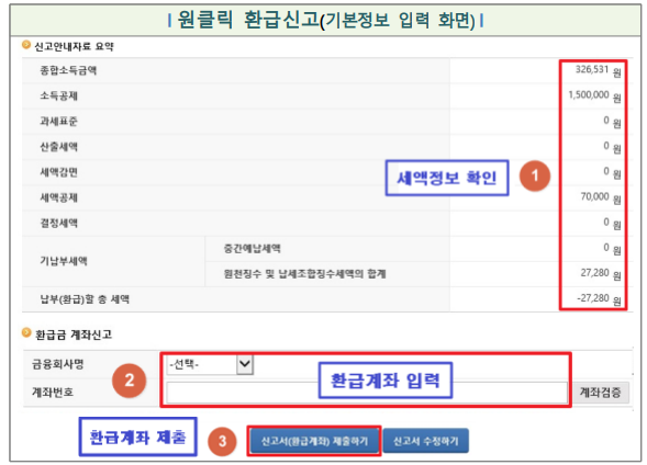 환급신고 시 여러 단계를 거치는 불편한 절차 없이, 첫 화면에서 세액정보를 확인하고, 환급계좌를 입력한 후, 신고서 제출하기 버튼을 한 번만 클릭하면 모든 과정이 완료되도록 하였습니다.