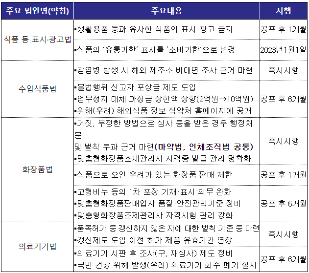 식품의약품안전처는 7월24일 「식품 등의 표시·광고에 관한 법률」, 「수입식품안전관리 특별법」, 「화장품법」, 「의료기기법」 등 6개 법률 개정안이 국회 본회의를 통과했다고 밝혔습니다.