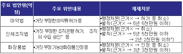 □ 마약류‧인체조직‧화장품과 관련된 허가‧심사 등을 거짓이나 부정한 방법으로 받은 경우 그 허가 등을 취소하고 벌칙을 부과할 수 있는 근거를 마련했습니다.