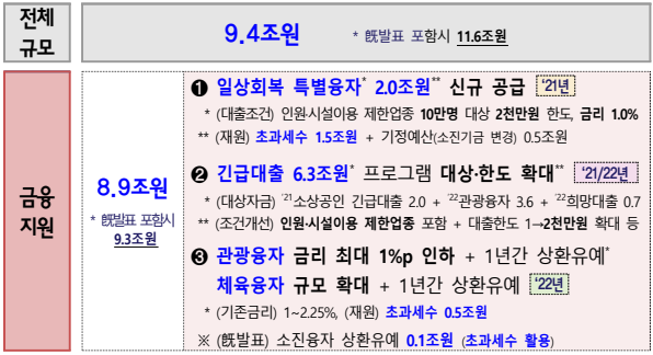 -> 기존 코로나 특례보증, 저신용 특별융자 등 대상·한도(1→2천만원) 확대(2.0조원)합니다.