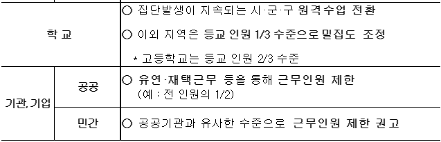 * 집단발생이 지속되는 시·군·구 원격수업 전환, 이외 수도권 지역의 유·초·중학교는 등교인원 1/3 수준, 고등학교는 2/3 수준으로 밀집도 조정
