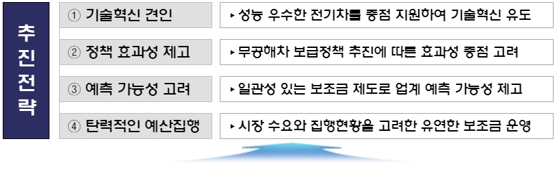 보조금체계를 기술혁신과 성능향상을 유도하는 방향으로 설계하여 고성능 차량의 가격 경쟁력 제고와 산업생태계 전환 촉진 필요