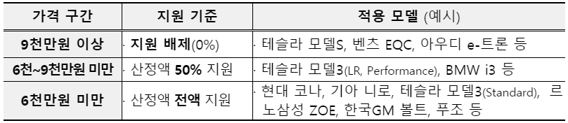 < 전기차 가격구간별 보조금 지원기준 >