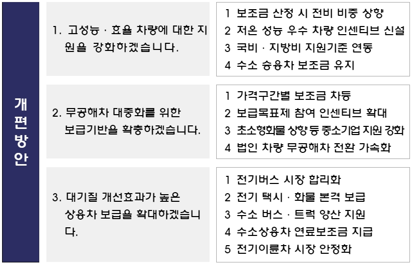 1. (성능 향상) 고성능·고효율 차량에 대한 지원을 강화하겠습니다.