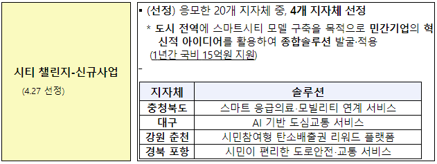 - 시티 예비사업 4곳 선정으로 스마트 챌린지 45곳 모두 선정 완료