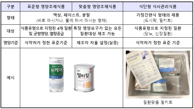 기존의 특수의료용도식품이 식사를 보충하여 섭취하는 분유형태의 분말제품 또는 음료형태의 유동식 제품인 반면, 식단형 식사관리식품은 가정간편식 형태의 조리식품(또는 간편조리세트 제품)으로서 일상적인 끼니를 그대로 대체하여 영양관리를 할 수 있는 차이가 있음