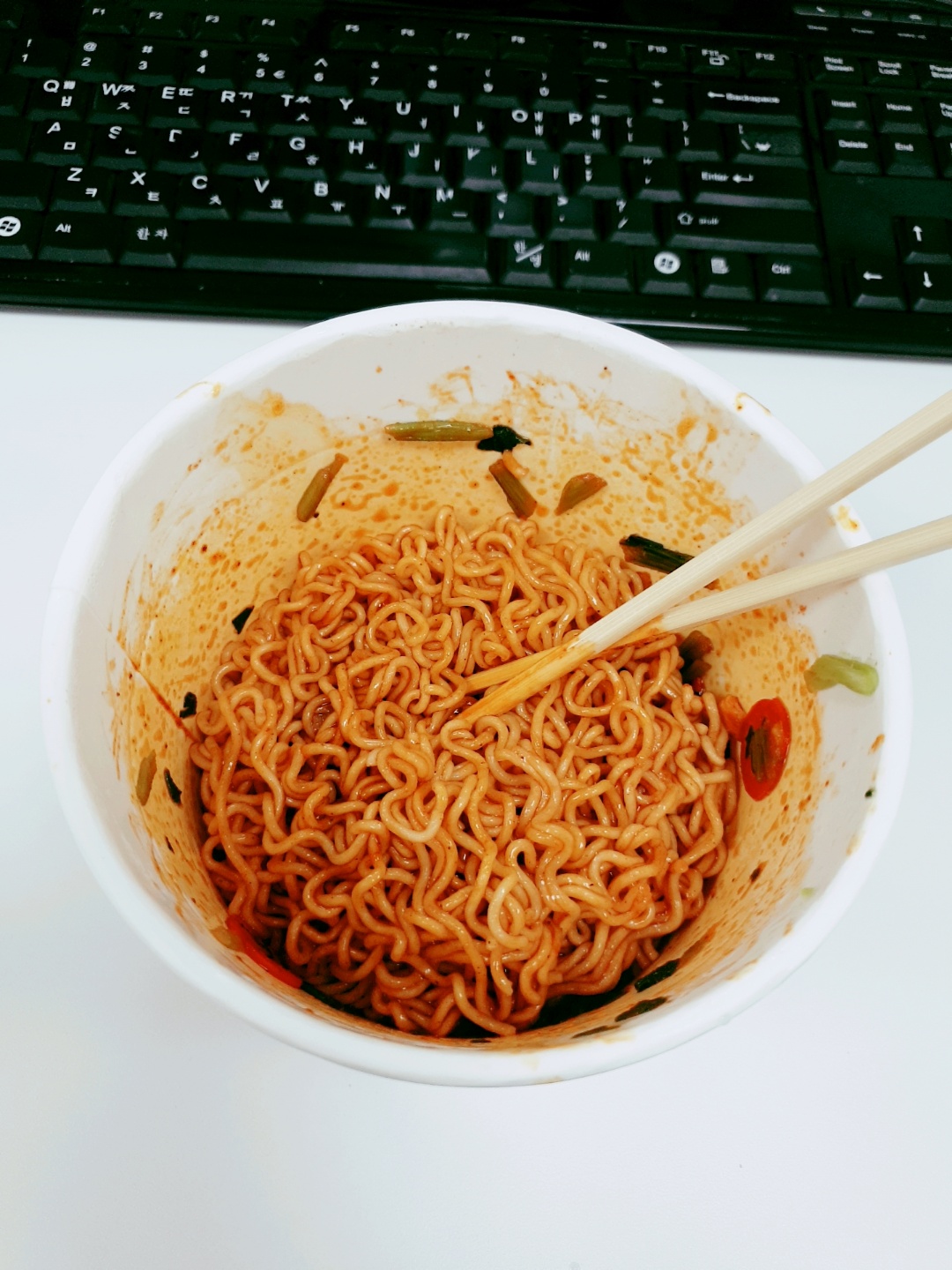 자~ 이제 신라면 볶음면(신볶음면) 컵라면이 준비가 다 되었으니 맛을 볼 차례입니다.