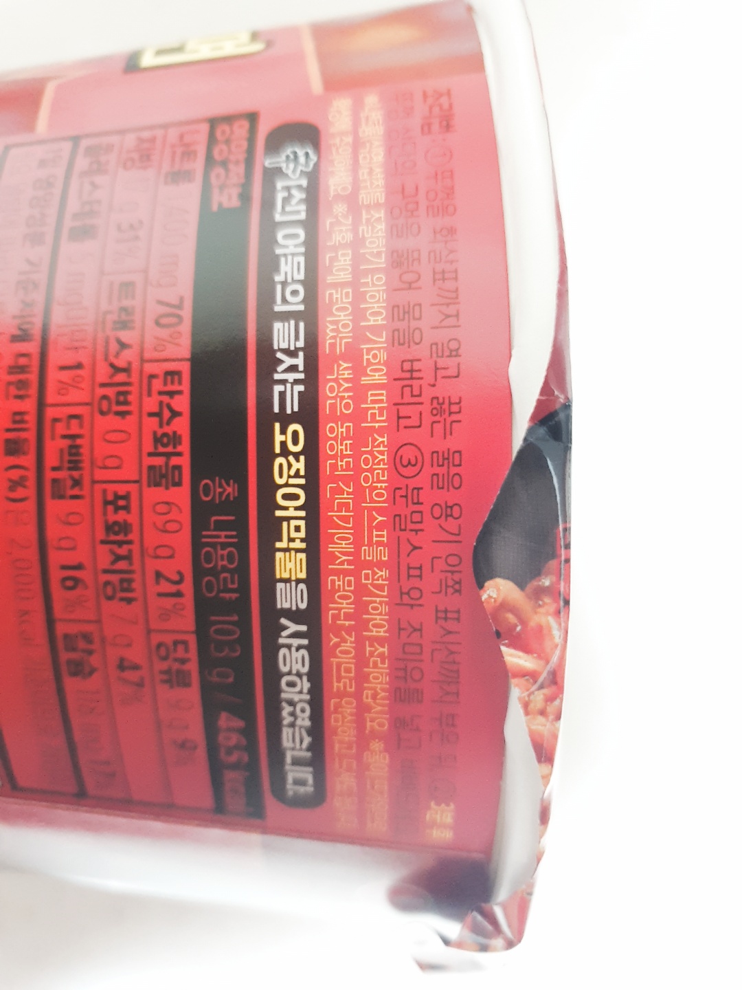 우선 신라면 볶음면(신볶음면)은 타사 비빔면 종류보다 맛이 좀 더 진하고 매운 것은 스프가 분말이라는 이유도 있는 것 같습니다.